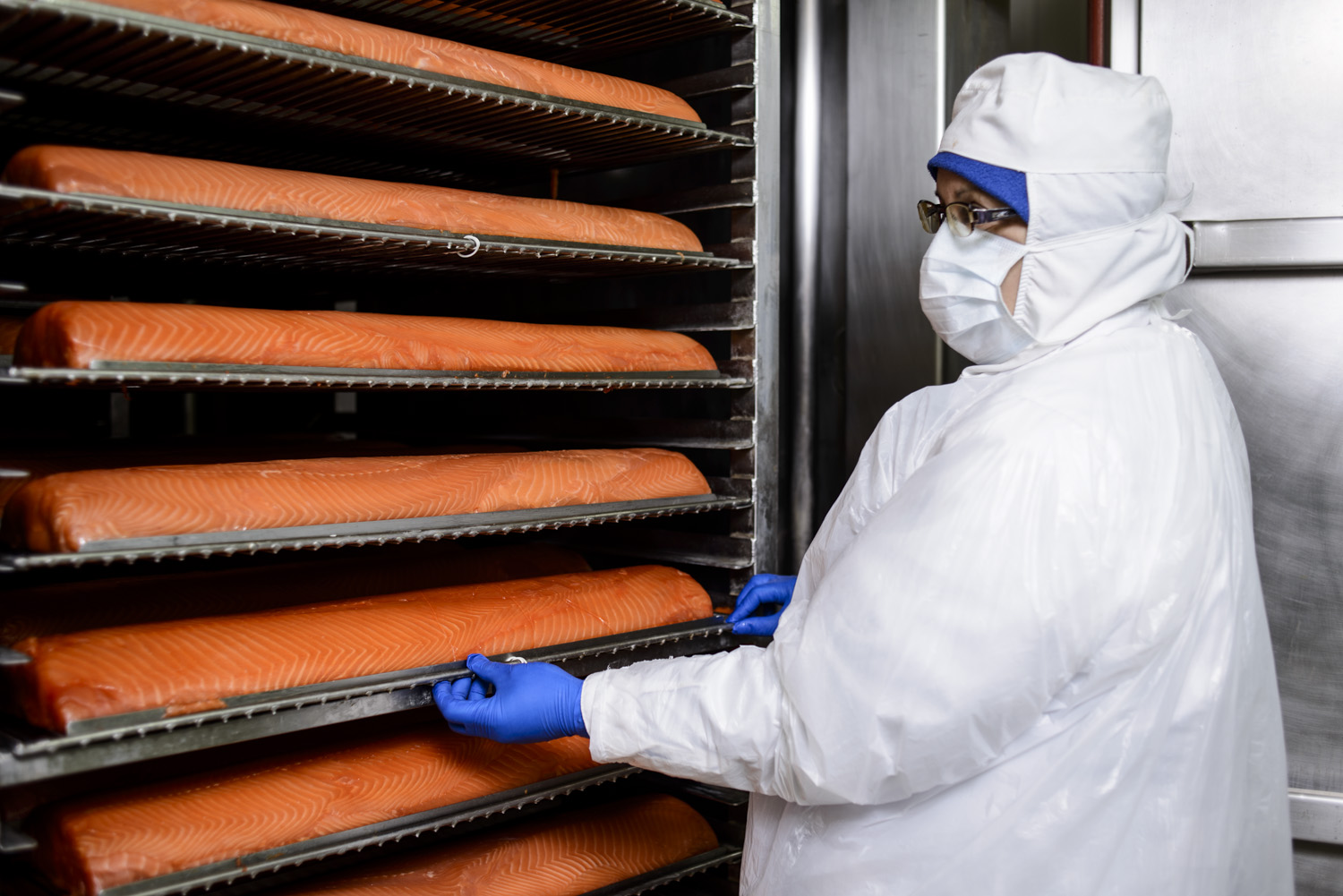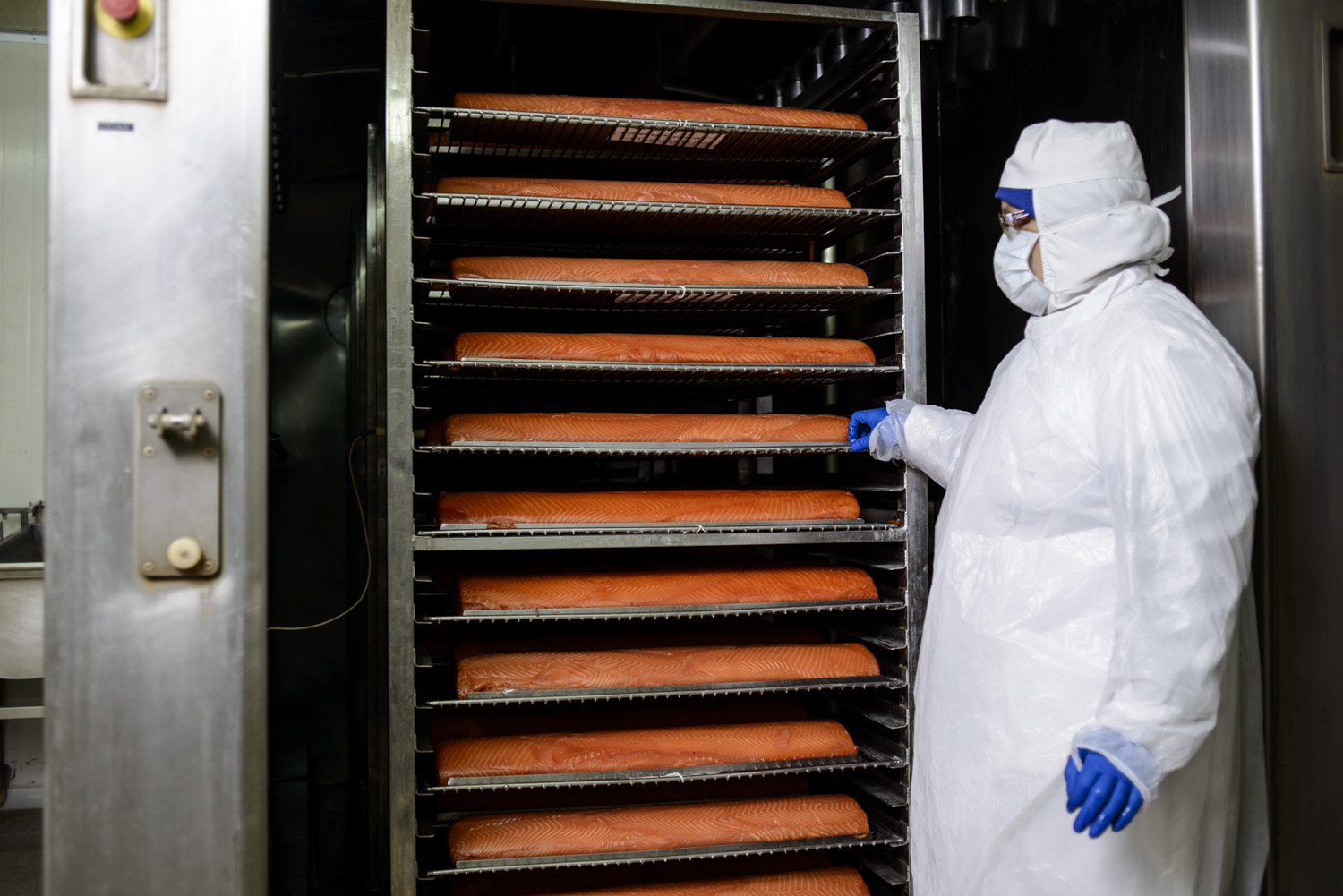 | 水揚げされたサーモンを冷凍しないで生鮮で工場に搬入、ブナの木で本燻製(冷燻) |