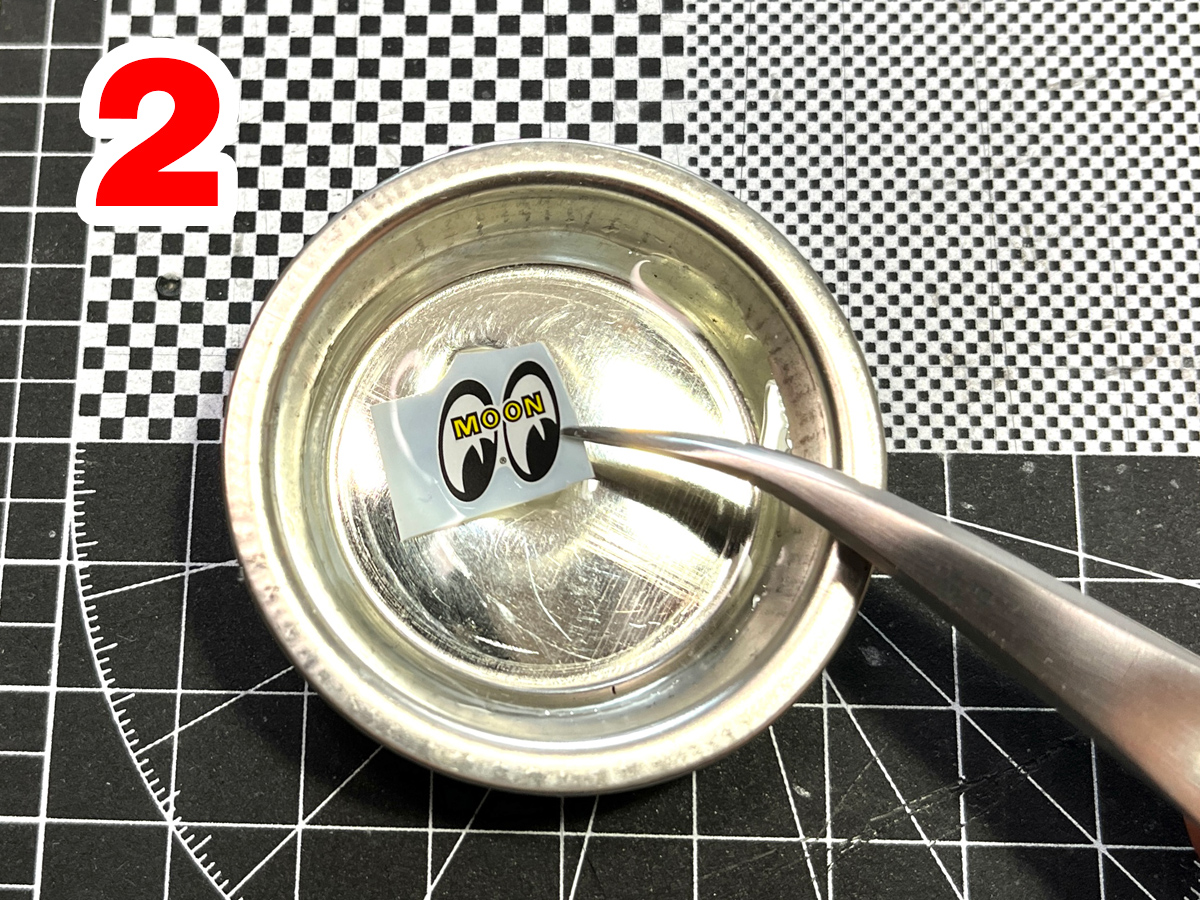 3.水に浸けたデカールを取り出し、キッチンペーパーなどの上で30〜40秒ほど置きます。