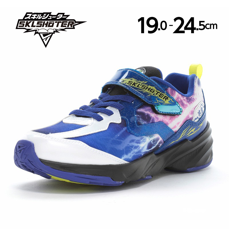 男の子の様々な潜在能力を解き放つシリーズ「スキルシューター」の「雷スキル ジンライ」です。「スキルを解き放て」をコンセプトに子どもたちの多様化するシーンに合わせた「SKL」をアウトソールに搭載しており、踏み込む際の荷重によって「SKL」が発動します。「雷スキル」は雷をモチーフにしたスパイク形状の「SKL」が走る際に発動し、走りをアシストします。脱ぎ履きしやすいゴム紐×バンドタイプです。踵からつま先に突き抜けるイナズマグラフィックが派手でカッコいい商品です。イエローはクリアパーツもポイントです。重さは21.0cmで片足約175gです。