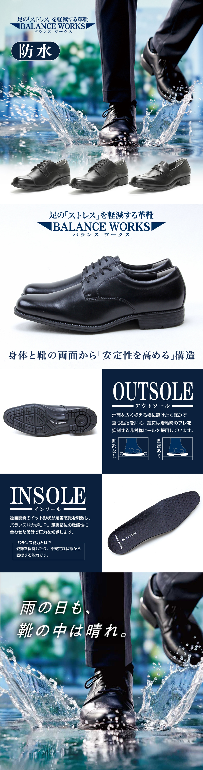 足のストレスを軽減するビジネスシューズ「バランスワークス」シリーズの「透湿防水」タイプ。「柔らかさ」と「安定性」を両立させた快適な着用感はそのままに、雨などによる外部からの水の浸入を防ぎつつ、汗による湿気を外部に逃がします。バランス能力に関係する感覚の一つである足裏感覚を刺激する設計のインソールと、中央部のくぼみで安定性に優れる設計のアウトソールを搭載しました。ムーンスター独自開発の機能で足と靴のグラつきを抑え、着用ストレスの軽減に貢献します。日常の通勤や外回り、就活等で足元から快適を求めるあなたにおすすめです。