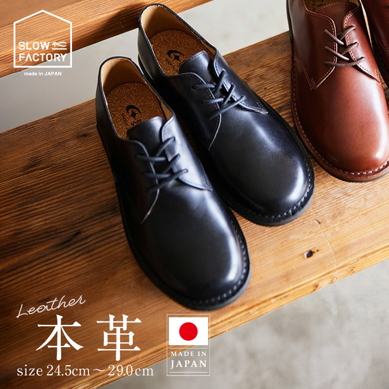ムーンスター「Slow Factory」は1956年から革靴生産を担ってきた佐賀の工場でゆっくり時間をかけ丁寧に作った靴です。甲の部分はやわらかくフィットし屈曲性が良いステッチダウン製法、かかと周りはしっかりホールドするために革を内側に包み込むつり込み式になっています。ソールは足なりの形に立体的にフィットするPUダイレクト製法です。ソールそのものがフットベッドの役割をはたすので足にやさしくここち良いつくりです。JAPAN LEATHERを採用。よりエイジングを楽しめるタイプの革を使っています。ベーシックでスタイルを選ばない3穴ハトメタイプです。