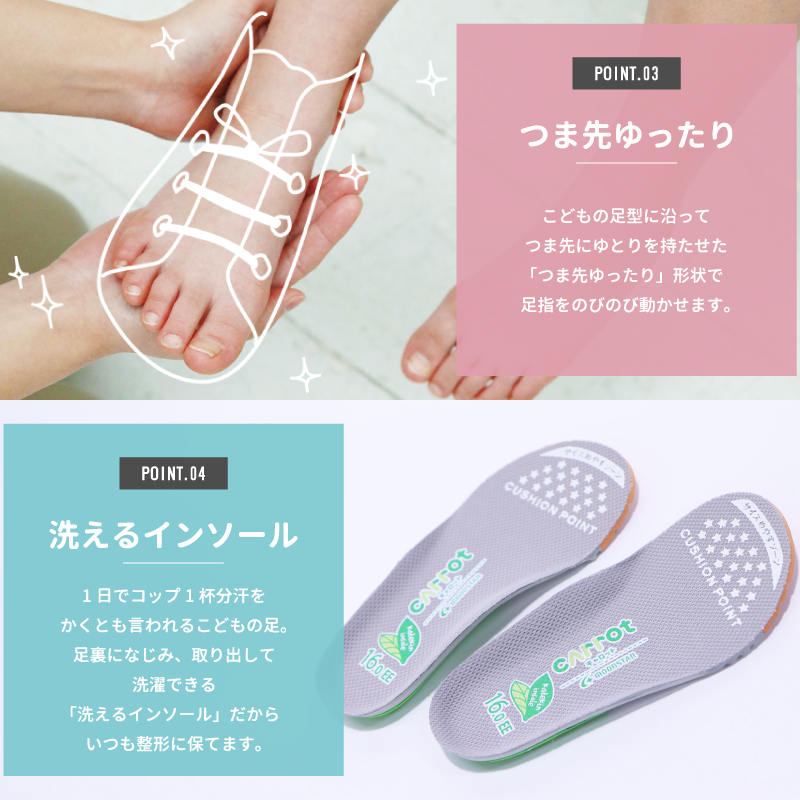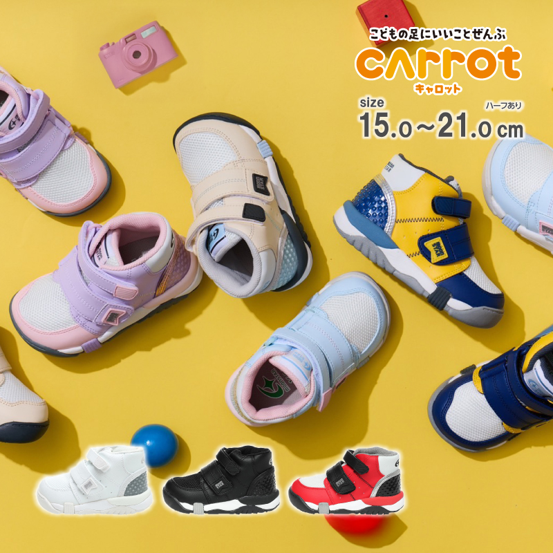 「こどもの足にいいことぜんぶ」の想いから生まれた「キャロット」のキッズシューズ。2本の甲バンドで固定することでホールド感に優れたハイカットモデル。足幅が細めのお子様に向けたウィズ調整中敷(1E付き)。独自開発の「4つの機能(つま先ゆったり/カウンターボックス/フレックスジョイント/洗えるインソール)」と、ハードシャンクが子どもの足の健やかな成長を促します。
