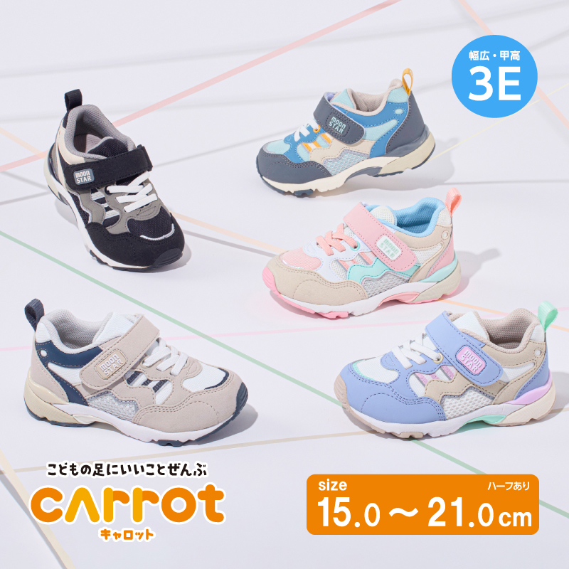 「こどもの足にいいことぜんぶ」の想いから生まれた機能シューズ「ムーンスター キャロット」HI!!シリーズのキッズシューズです。幅広のお子様に向けた「3E」商品です。トレンドを取り入れたボリュームのあるデザインです。カジュアルな服装に合わせやすく、お出かけやレジャーにおすすめの一足です。サイドには夜間の安全性を高める反射材を搭載。子どもの足の成長をサポートする「4つの機能(つま先ゆったり/カウンターボックス/フレックスジョイント/機能性カップインソール)」により、健やかな成長を促します。