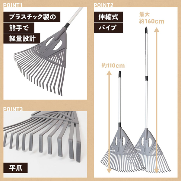 スタンダード熊手&ハンディ熊手の2way使用が可能で、お庭の落ち葉集め、掃除、土ならしに活躍します。