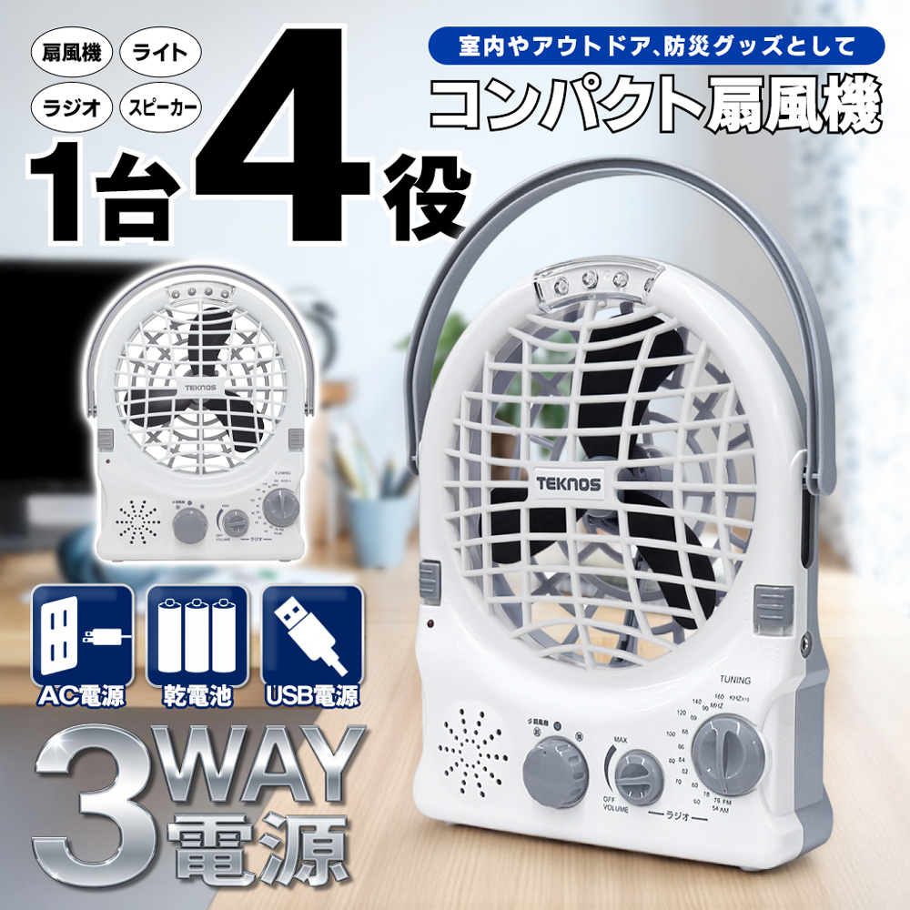 卓上扇風機 1台4役 3電源 小型 AM/FMラジオ ライト スピーカー搭載 防災グッズ 扇風機 コンパクト 多機能ファン デスク 音楽 情報 送料無料- 60N◇ 多機能扇風機