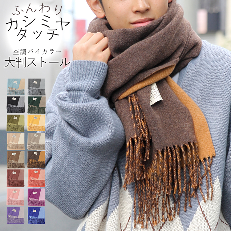 大判 ストール メンズ 厚手 リバーシブル 春 秋 冬 用 カシミヤ タッチ 杢調 バイカラー 差し色 カラバリ 全16色 プレゼント ギフト 父の日
