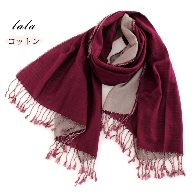 | コットン100%のふわりとした優しい触り心地で快適に身につけることができます。繊維の先が丸く柔らかいので、チクチクしたりざらつくことはありません。肌への摩擦も少ないので敏感肌の方やアレルギー体質の方でも安心です。スタンダードな大判サイズで巻きでも羽織でもどちらでも使いやすくなっています。特に春夏の日除けや冷房対策としても使いやすく、ファッションのアクセントとしてなら一年中使うことができます。 |