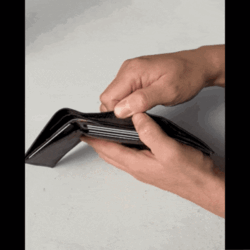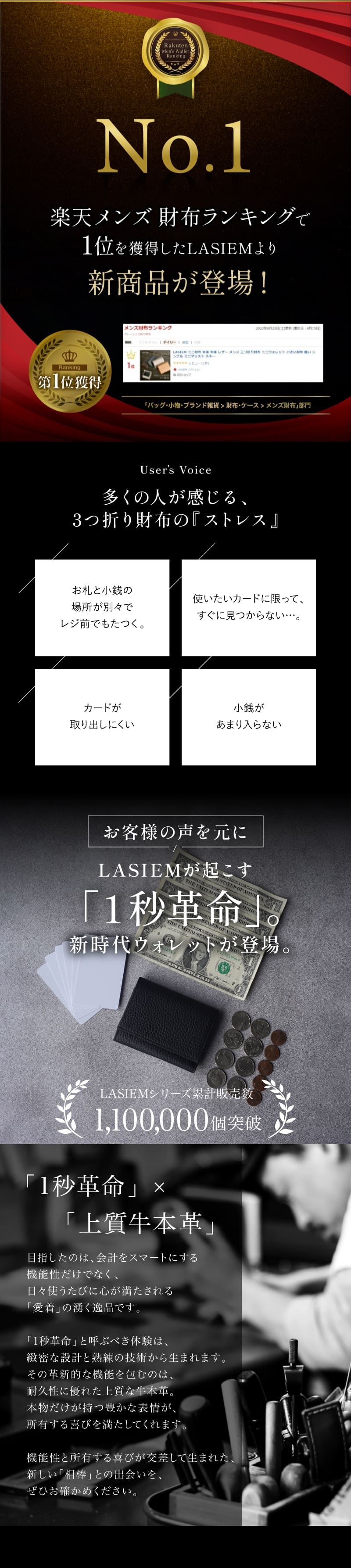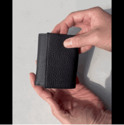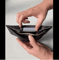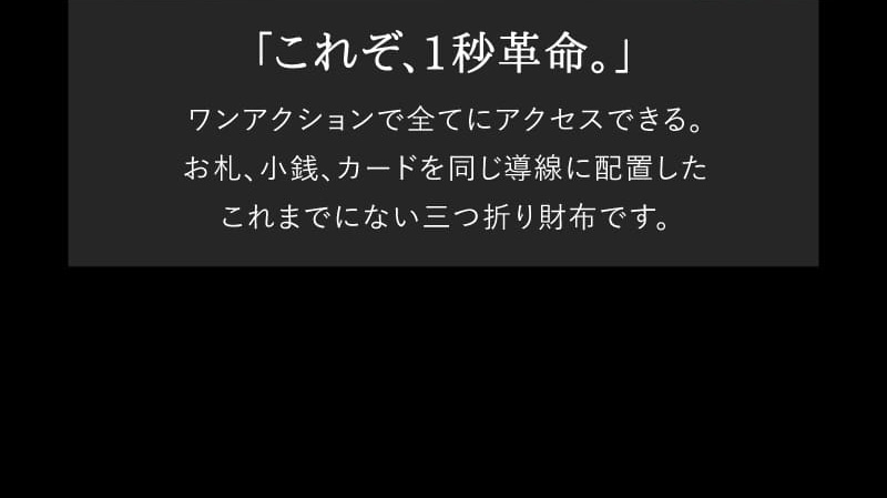 お札、小銭、カードを同じ導線に配置したこれまでにない三つ折り財布です。