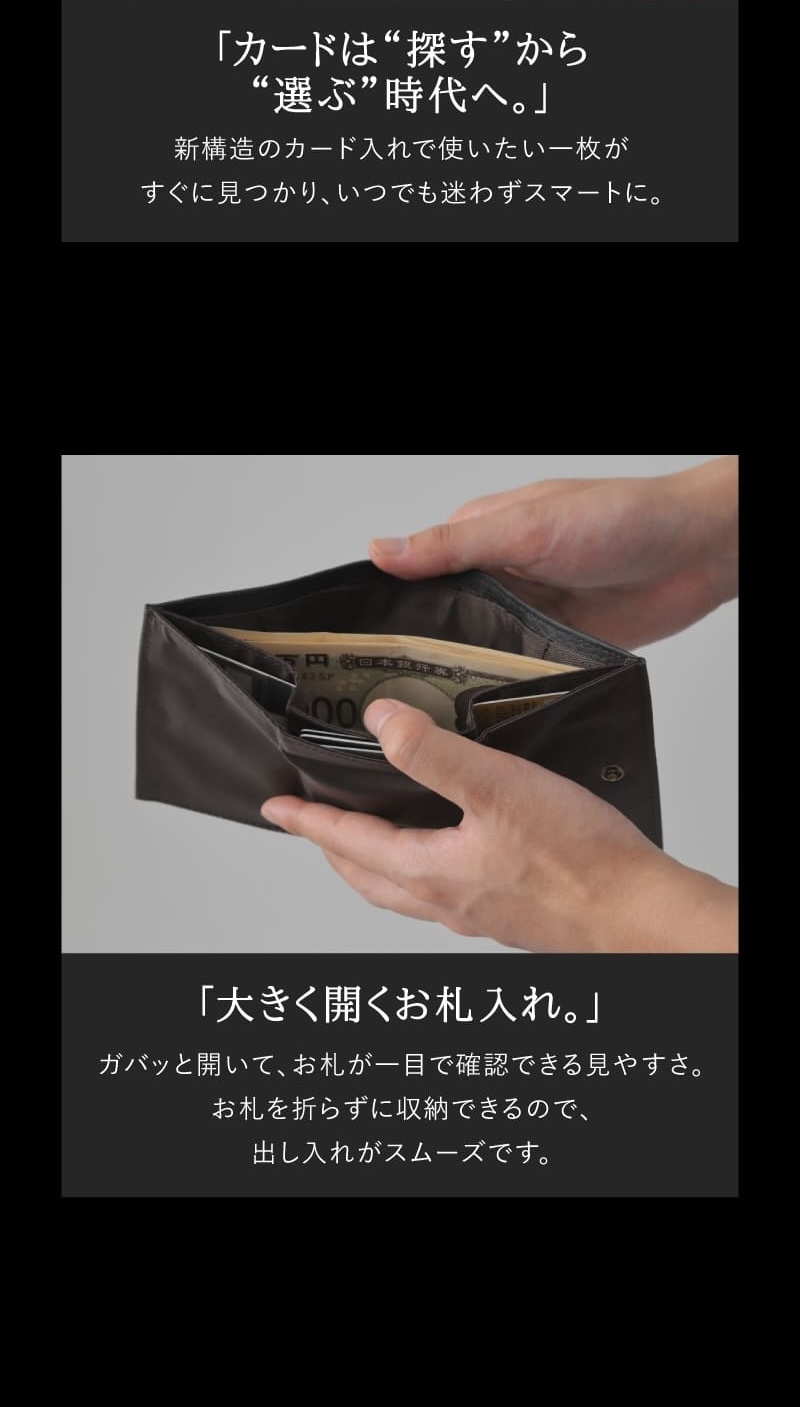 新構造のカード入れで使いたい一枚がすぐに見つかり、いつでも迷わずスマートに。