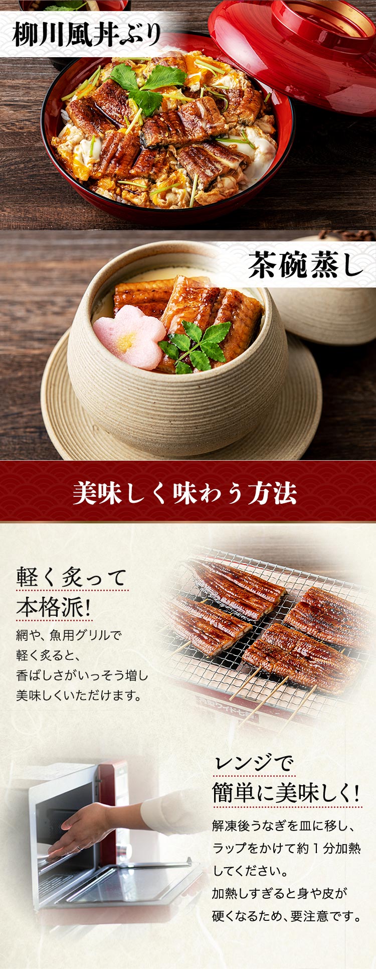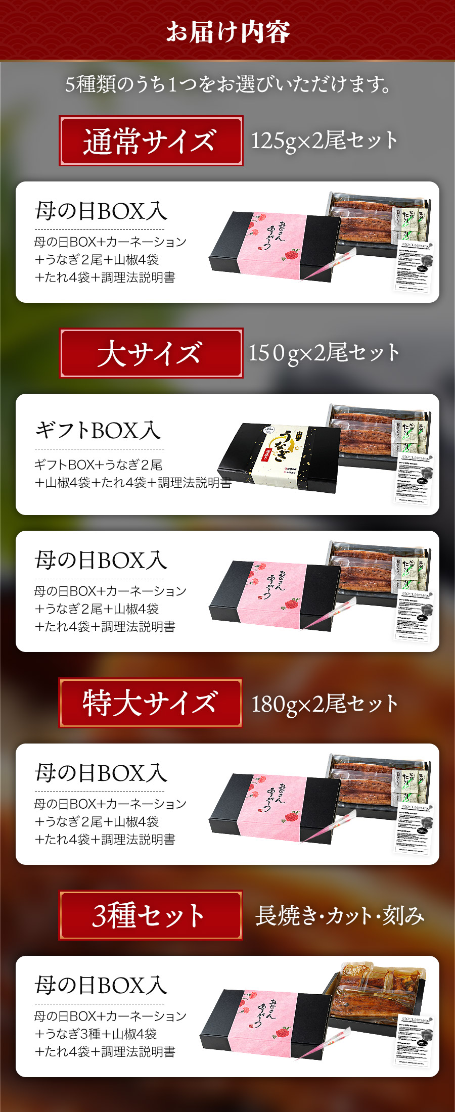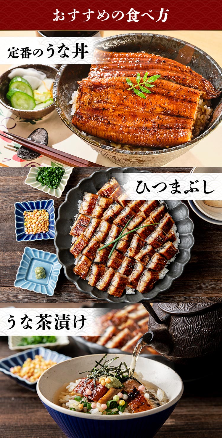うなぎ2尾(通常:約125g×2、大:約150g×2、特大:約180g×2)または3種セット(長焼き1尾、カット60g×2、刻み75g)