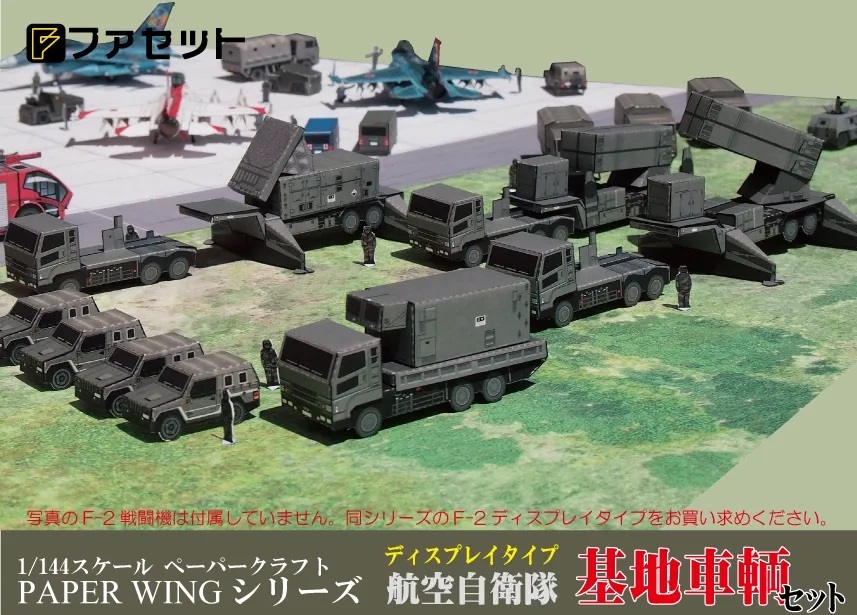 航空自衛隊の基地で活躍している車輌など各種トラックからペトリオット発射機やレーダー車輌まで全11種を収録したジオラマ情景付きのディスプレイタイプの紙模型です。