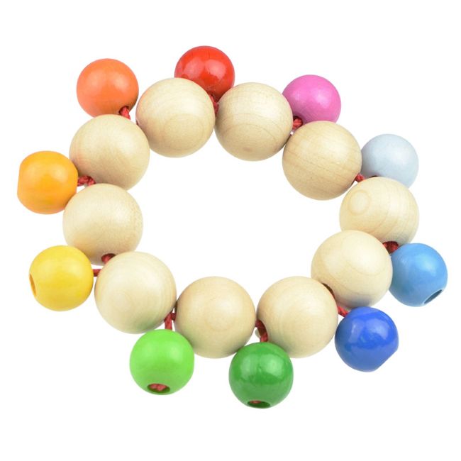 つながった木玉をつかみやすく握りやすいベビーラトルです。