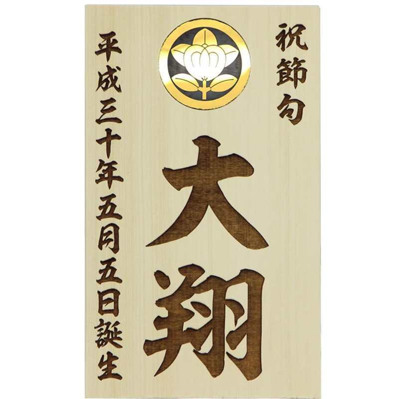 レーザー彫刻名入れ木札 金属調家紋埋め込み 9.5×15cm お名前・生年月日・家紋が入ります 五月人形 初節句 お祝い