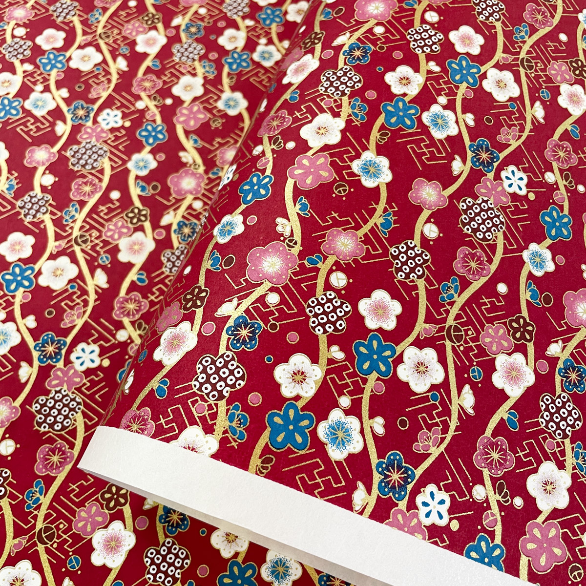友禅和紙 臙脂色 華やか立涌に梅の花 紗綾型 紅赤 大判 約63x93cm 千代紙