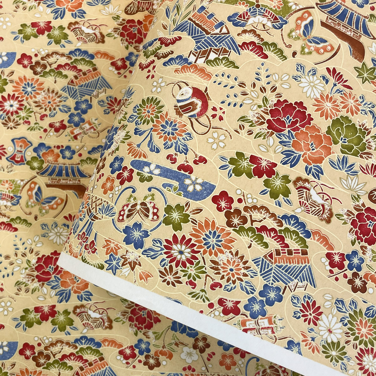 友禅和紙 民芸風 宝づくし 松竹梅 菊 牡丹 菖蒲 ベージュ クリーム 大判 約63x93cm 千代紙