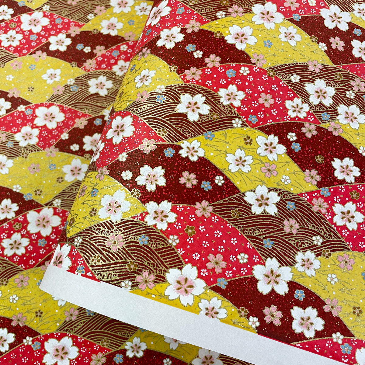 友禅和紙 華やかな波と桜 赤 黄 茶色系 大判 約63x93cm 千代紙