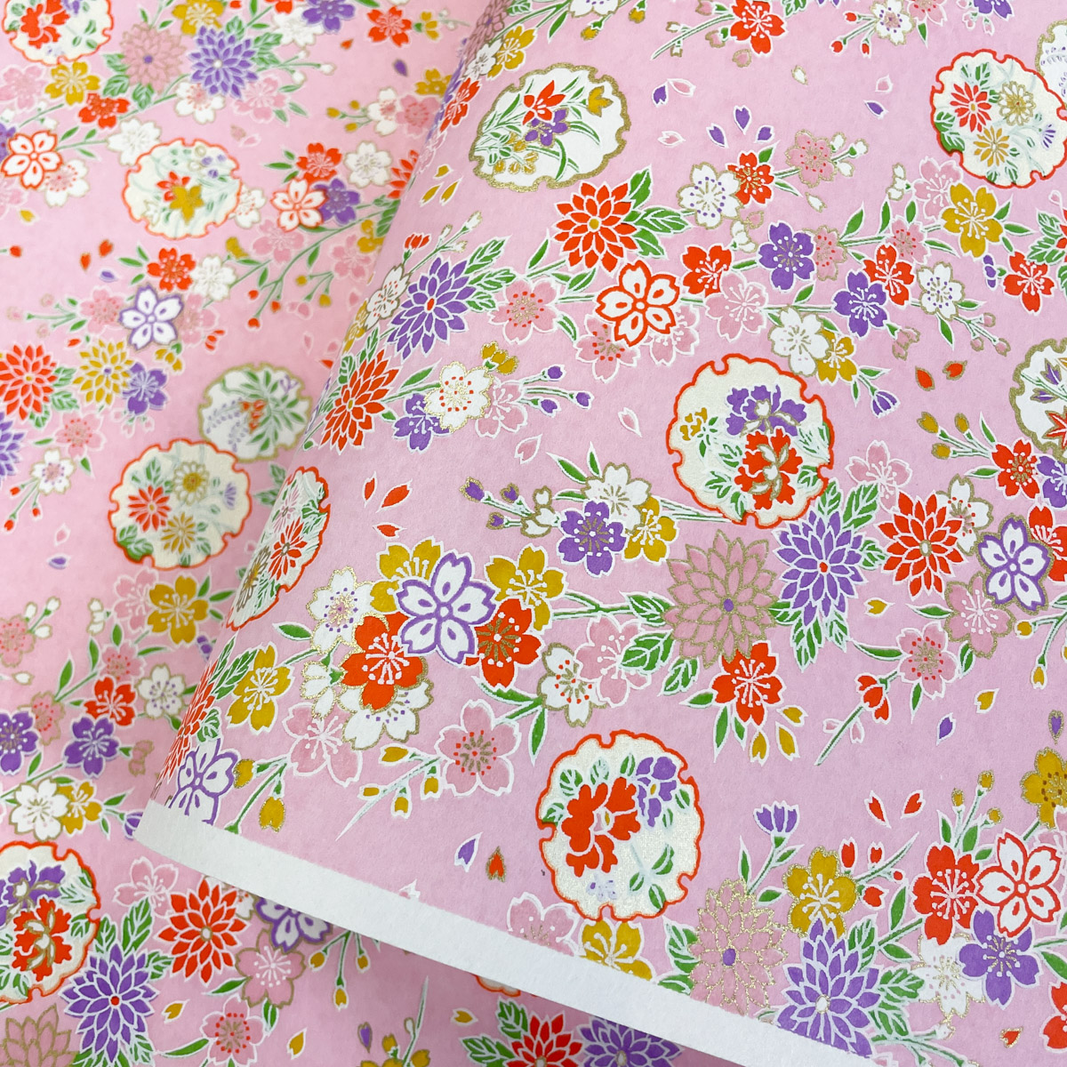 友禅和紙 華やか桜と菊 花模様の雪輪 ピンク 桃色地 大判 約63x93cm 千代紙