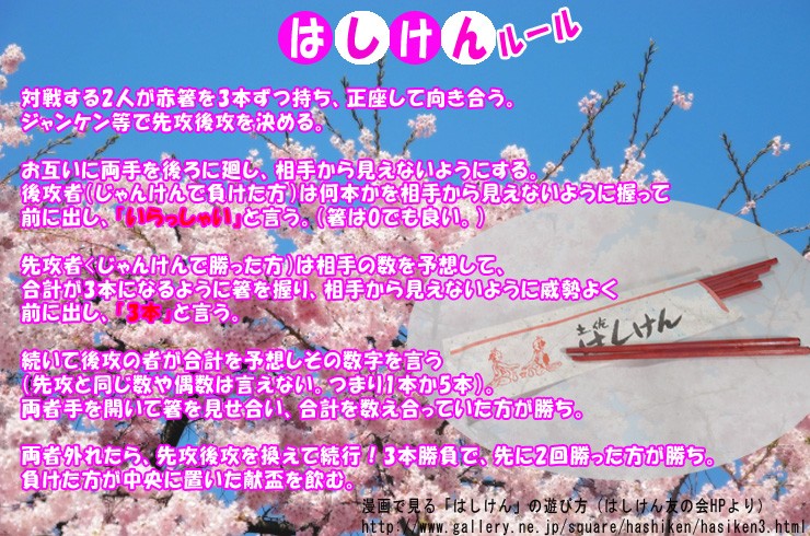 箸拳(はしけん)土佐のお座敷遊び はしけん遊び方の説明が入っています、お花見や歓迎会、送別会の余興に