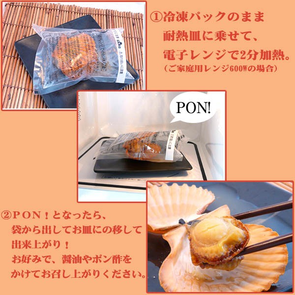 | 解凍方法 | 【調理方法】 1.冷凍パックのまま、お皿に乗せ600W電子レンジで2分温めて下さい。 2.袋の端を切って袋から取り出し(火傷に注意)、お皿に移してお好みで醤油、ポン酢、バター等を少量かけて召し上がって下さい。 |