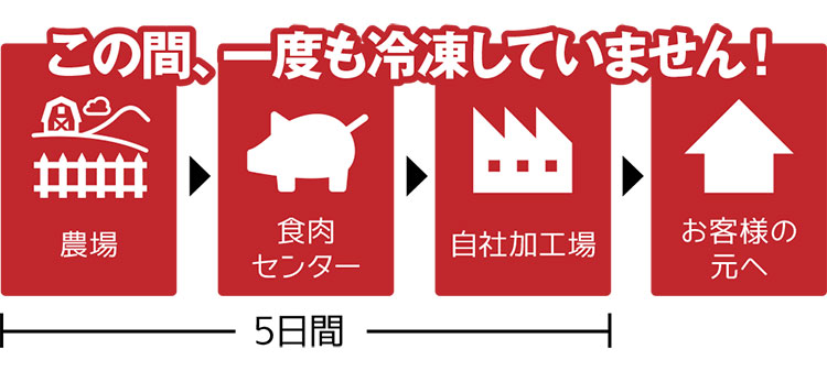 下記の流通ルートでみなさまのもとへお届けします。しっかりとしたルートなので、安心安全をお約束します。また、一般的に豚肉が最も美味しいのは5日目前後と言われています。店頭で扱うのは、農場出荷から5日前後。こだわり抜いたフレッシュポークは格別の美味しさです。