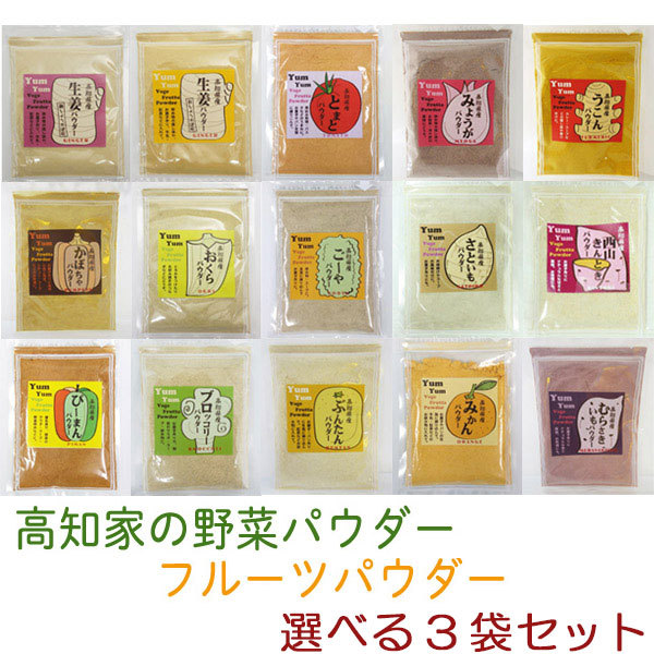 | 商品名 | 【高知家】の野菜パウダー、果物パウダー | 商品説明 | 高知県産の野菜と果物を100%使用しています。 独自の製法により、素材の特性を生かしたパウダーに仕上げました。 砂糖や発色剤などは加えていません。 |