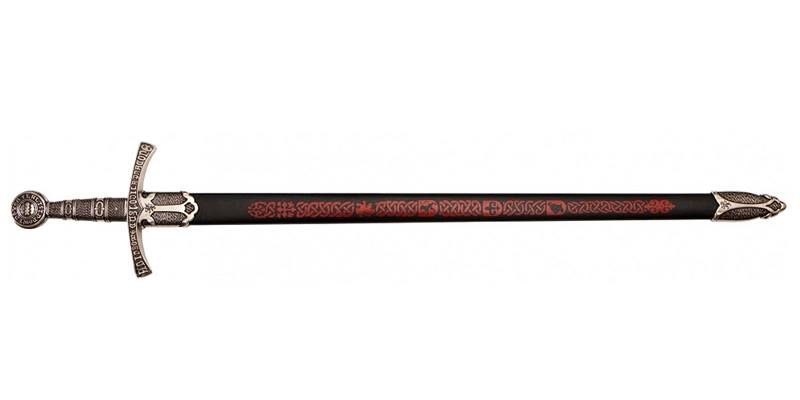 着脱可能なプラスチック製の鞘が付いた中世の剣の非常に美しい複製。この剣にはラテン語で「真実の名の下に、眠らないドラゴンに守られている」という意味の碑文があります。剣は一般的に中世の騎士たちの戦闘用の武器として好まれていました。