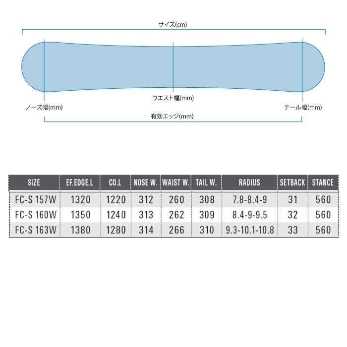 [商品名] 2026/2027 OGASAKA FC-S WIDE[サイズ] 157WIDE/160WIDE/163WIDE[カテゴリ] オールラウンド/フリースタイル/カービング/フリーライド「FC-S」は、高速域での推進性と安定性を考慮して設計したFCシリーズのエキスパートモデルで、JSBAテクニカル選手権フリースタイル女子クラスで11度の優勝実績を持つ中本優子デモが使用しているモデルです。Sは「Stiff(硬い)」を意味しますが、硬いだけでなくサイドカーブを浅く設計しているため、ターン前半で圧をかけてボードをたわませられれば、踏み込んだパワーが推進力となりボードをぐんぐん加速させていくように落下していきます。25-26 モデルから、全サイズのトップシートに高価なポリアミドの採用。さらに、26-27 モデルでは、芯材を「ASP2コア」から「3Sコア」へ変更し、補強材も高反発?高強度ポリエチレン素材を採用するなど、構成を変更した上でフレックスバランスの調整を行い、エッジグリップの良さとターン後半の抜けの良さの両方の性能強化を実現しました。