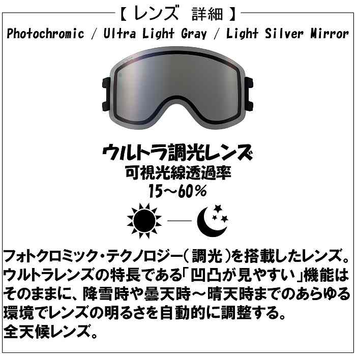 フォトクロミック・テクノロジー(調光)を搭載したレンズ。ウルトラレンズの特長である「凹凸が見やすい」機能はそのままに、降雪時や曇天時〜晴天時までのあらゆる環境でレンズの明るさを自動的に調整する全天候レンズ。