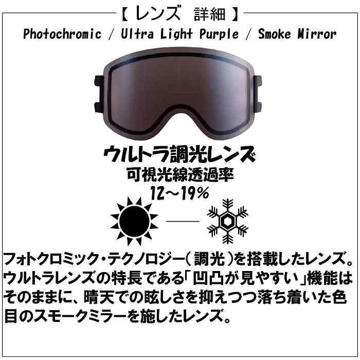 スノーボーディングの常 識を変える換 気 機 能「A-BLOW SYSTEM」採用モデル!近代スノーボードシーンにおいて最も革新的なギアとして熱狂的な支持を受ける“呼吸するゴーグルBANK”。ゴーグル内換気システム「A-BLOW SYSTEM」により内部の暖かい空気を外へ排出し新鮮な外気を取り入れることでレンズのくもりを防ぎます。フォトクロミック・テクノロジー(調光)を搭載したレンズ。ウルトラレンズの特長である「凹凸が見やすい」機能はそのままに、晴天での眩しさを抑えつつ落ち着いた色目のスモークミラーを施したレンズ。レンズカラーPhotochromic / Ultra Light Purple / Smoke Mirror透過率 12%-19%