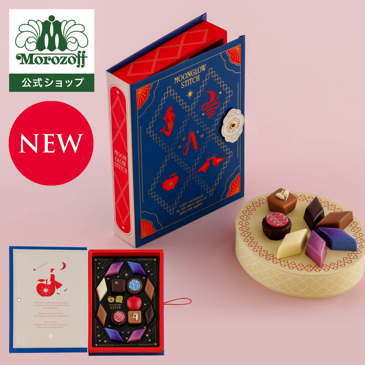 月明かりの下、アステルが日記をつけるように縫う夜の刺繍を表現した、ブック型パッケージ入りのチョコレートアソート。