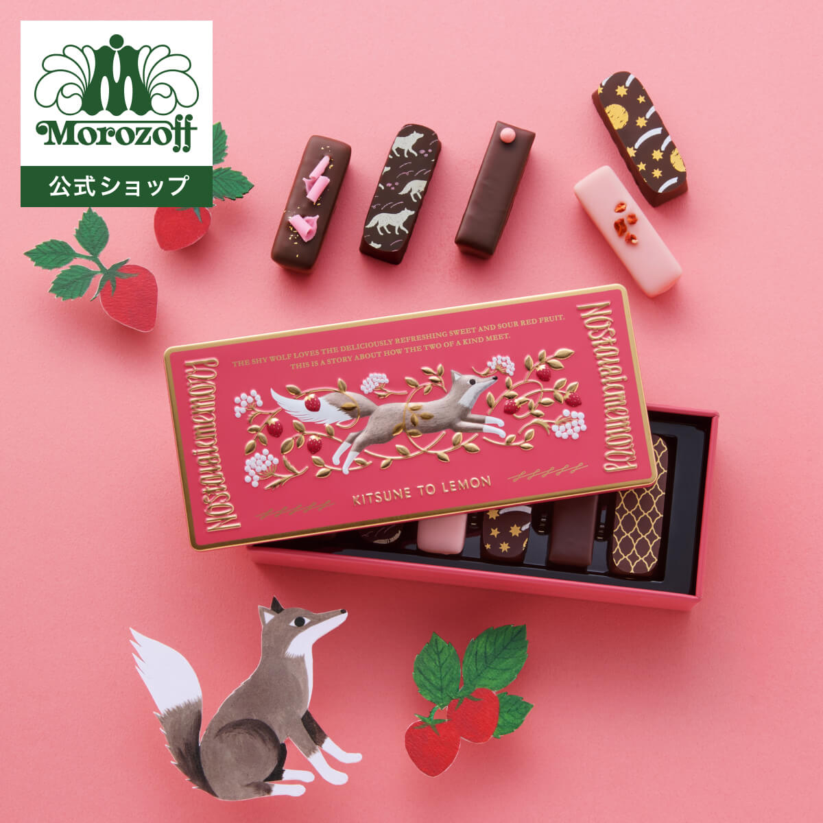 ときめく赤い実(いちご)、真っ暗闇のほら穴(カフェオレ)、とっておきのご馳走(ダブルイチゴクリーム)、とろける満月(ハニーキャラメル)、イチゴ畑をわたる風(ストロベリーシャンパン)、オオカミの憧れの香り(レモン)のお味がお楽しみいただけます。