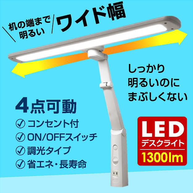 | 当店の おすすめ ポイント | \LEDで明るく照らす!/ 目にやさしいデスクライト ・LEDで省エネ&長寿命 ・ライト部がコンパクトに軽くなりました ・本体にON/OFFスイッチ付き ・500Wまで使えるコンセントが付いてるので他の電化製品の電源として ・ご使用の環境や目的に合わせて明るさを無段階に調節可能 |