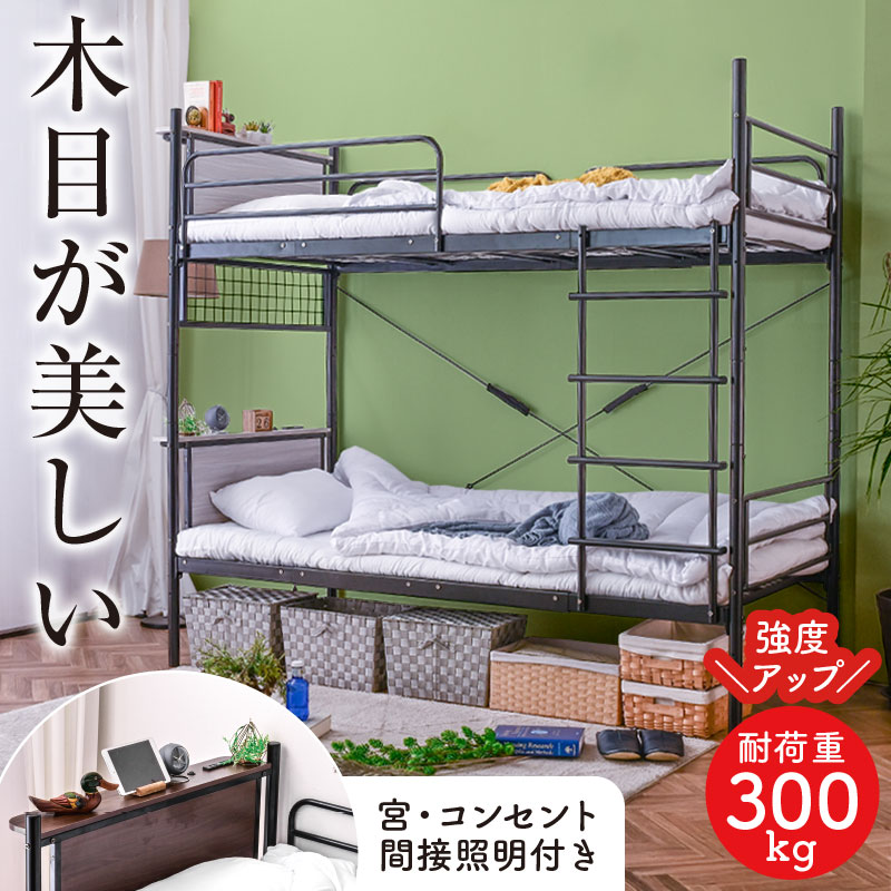大好評 強度アップ 2段ベッド 二段ベッド ベッド パイプベッド シングル ライト コンセント 分割 分離 木目 パイプ 頑丈 大人用 業務用 宮付き ムーンLIGHT