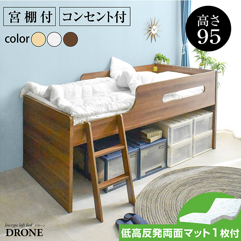 | 当店の おすすめ ポイント | \収納力抜群!ロフトベッド/ ・たっぷり収納!ベッド下部を有効に使えます ・高さを抑えた95cmのミドルタイプ ・宮棚、2口コンセント付き ・広い入口で大人の方も出入りがラクラク ・低く安定したハシゴでお子様も楽々上り下り ・ハシゴの位置が左右どちらでも変更できます ・高めのサイドフレームで布団などの落下防止 ・さらりとした手触りで木のぬくもりを感じられる木目調 ・オールシーズン快適なスノコ床板 ・小さなお子様から大人でも安心してお使い頂けます |