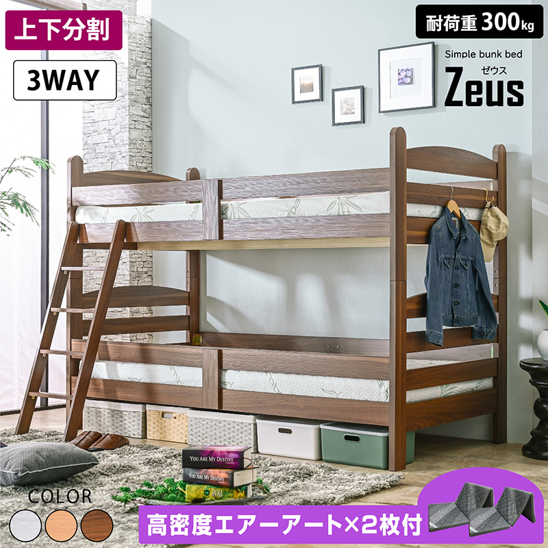 100台限定プライス 二段ベッド シングル 3Way 2段ベッド 分割可能 耐震式 耐震構造 高さ145 子供 大人 おしゃれ ゼウス (エアーアート マットレス2枚付)