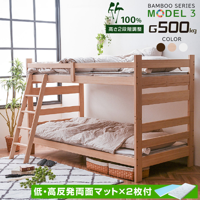 | 当店の おすすめ ポイント | \木の約3倍以上強度がある竹100%使用!/ ・持続可能なカーボンニュートラル ・縦方向に補強板を追加してさらに強度アップ! ・上下段のつなぎ目をしっかり固定することで縦ブレをなくし、開き止めで横ブレを防ぐ ・高さ134cmのロータイプだからお部屋の圧迫感がない ・下段ベッドは高さ2段階調整可能 ・竹製すのこ床板は抗菌効果 ・安心・安全のホルムアルデヒド濃度 ・将来の事も考えてシングルにもできる |