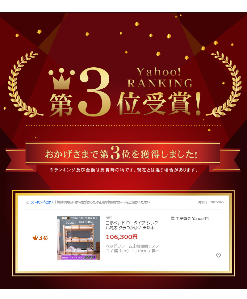 | 当店の おすすめ ポイント | \木の約3倍以上強度がある竹100%使用!/ ・持続可能なカーボンニュートラル ・民泊にも最適!分離可能でアレンジ自由自在 ・高さは199.5cmと3段ベッドにしては使いやすい ・下段の高さを低くすることでベッド中の空間が広い ・省スペースに使えて独立している垂直はしご ・スマホスタンド&2口コンセント付き宮棚 ・明るさがあると便利なLED照明付き ・縦方向に補強板を追加してさらに強度アップ! ・2、3段目にすのこを支える補強板を追加 ・つなぎ目をしっかり固定することで縦ブレをなくし、開き止めで横ブレを防ぐ ・竹製すのこ床板は抗菌効果 ・安心・安全のホルムアルデヒド濃度 |