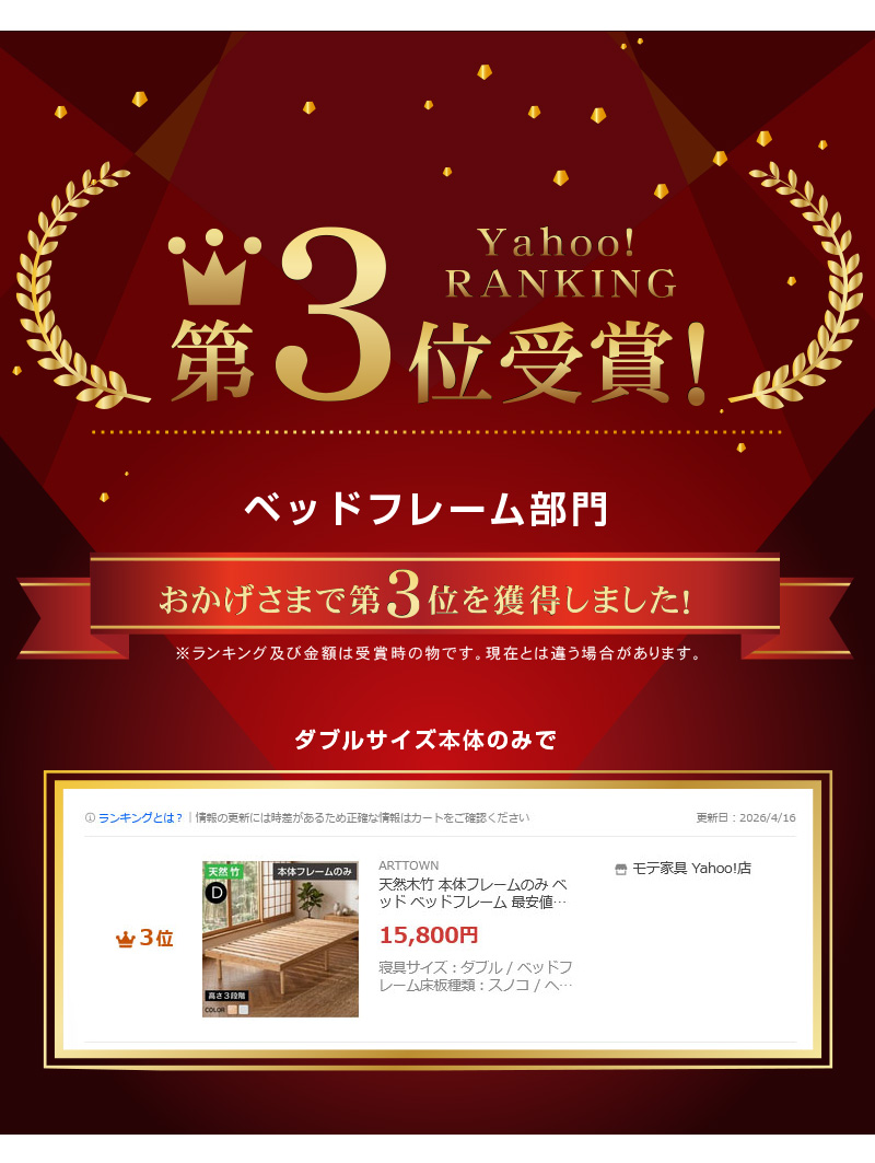 | 当店の おすすめ ポイント | \木の約3倍以上強度がある竹100%使用!/ ・持続可能なカーボンニュートラル ・竹製すのこ床板は抗菌効果 ・手触り、肌触りがいいウレタン塗装を採用 ・安心・安全のホルムアルデヒド濃度 ・耐久性に優れた極厚10mmスノコ ・縦方向の桟板を追加して強度アップ ・桟板にフェルトを追加して軋み音をカット ・3段階高さ調整(ロースタイル、ミドルスタイル、ハイスタイル) ・脚の裏には傷防止フェルト付き ・シングル2台を並べてキングサイズにできる |