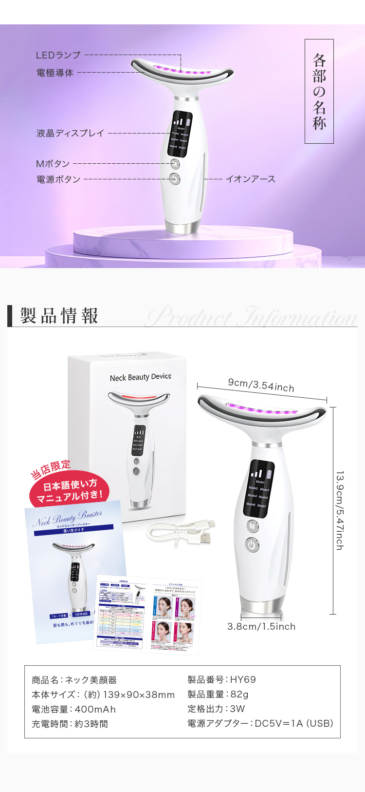 美顔器 ネック美顔器 首 デコルテ イオン導入 LED マイクロカレント 美顔器ジェル付き ネックリフト 日本語説明書付 ネックビューティーブースター 爆買