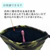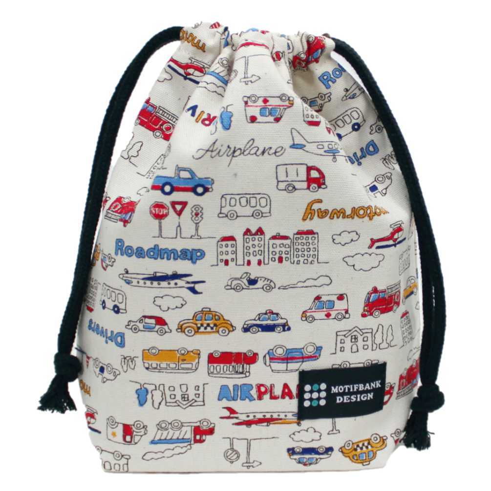 【マチ付き巾着】歯ブラシコップ入れ 乗り物柄 アイボリー 内布:撥水生地 ランチグッズ 入園入学 幼稚園 保育園 歯磨き入れ