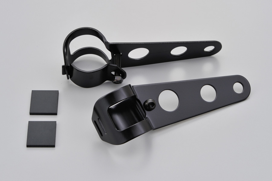 フロントフォークにクランプしてヘッドライトを挟み込むタイプのヘッドライトブラケット。