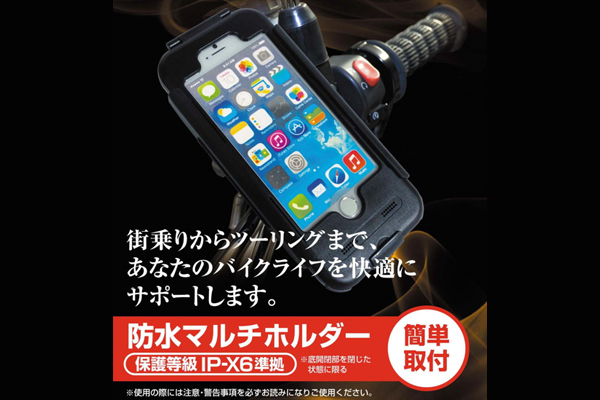 ■適合■・12〜27φハンドル■詳細■○iPhone6専用○保護等級 IP-X6準拠<セット内容>○防水マルチホルダー(本体)○マウントブラケット○ラバーパッド○六角レンチ○イヤホンケーブルスペーサー○充電ケーブルスペーサー○電源スイッチ(リペア)▲注意点▲※防水は底開閉部を閉じた状態に限ります。※運転や視界の妨げとなる位置には設置しないでください。※走行中は危険ですので、内部機器の使用はお控えください。※走行中のイヤホンの使用は、周りの音が聞こえなくなり危険ですのでお控えください。※長時間のご使用による経年劣化などにより製造時の機能を徐々に発揮できなくなる恐れがあります。※防水性能は保護等級IP-X6標準仕様(底開閉部を閉じた状態に限る)であり、完全防水ではありません。※水没、水中に対応するものではありません。内部機器の故障につながる恐れがあります。※雨天時のケーブルによる充電、イヤフォンの使用は、スペーサーを利用しても底部開閉口より浸水する恐れがあります。ご注意ください。※充電ケーブルはアップル純正を必ずお使いください。(スペーサーが破損する