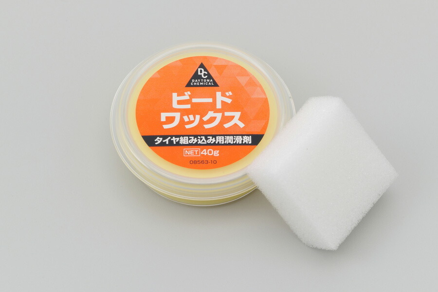 タイヤ交換の際の必需品、ビードワックス。容量40グラム、コンパクトな容器サイズ(φ70×20mm)で、スポンジ付属。