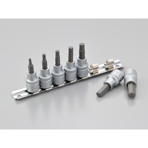 インチサイズの六角ビットソケット7個セット。付属のソケットホルダーは両端にビス穴付き。工具箱などに取付可能です。