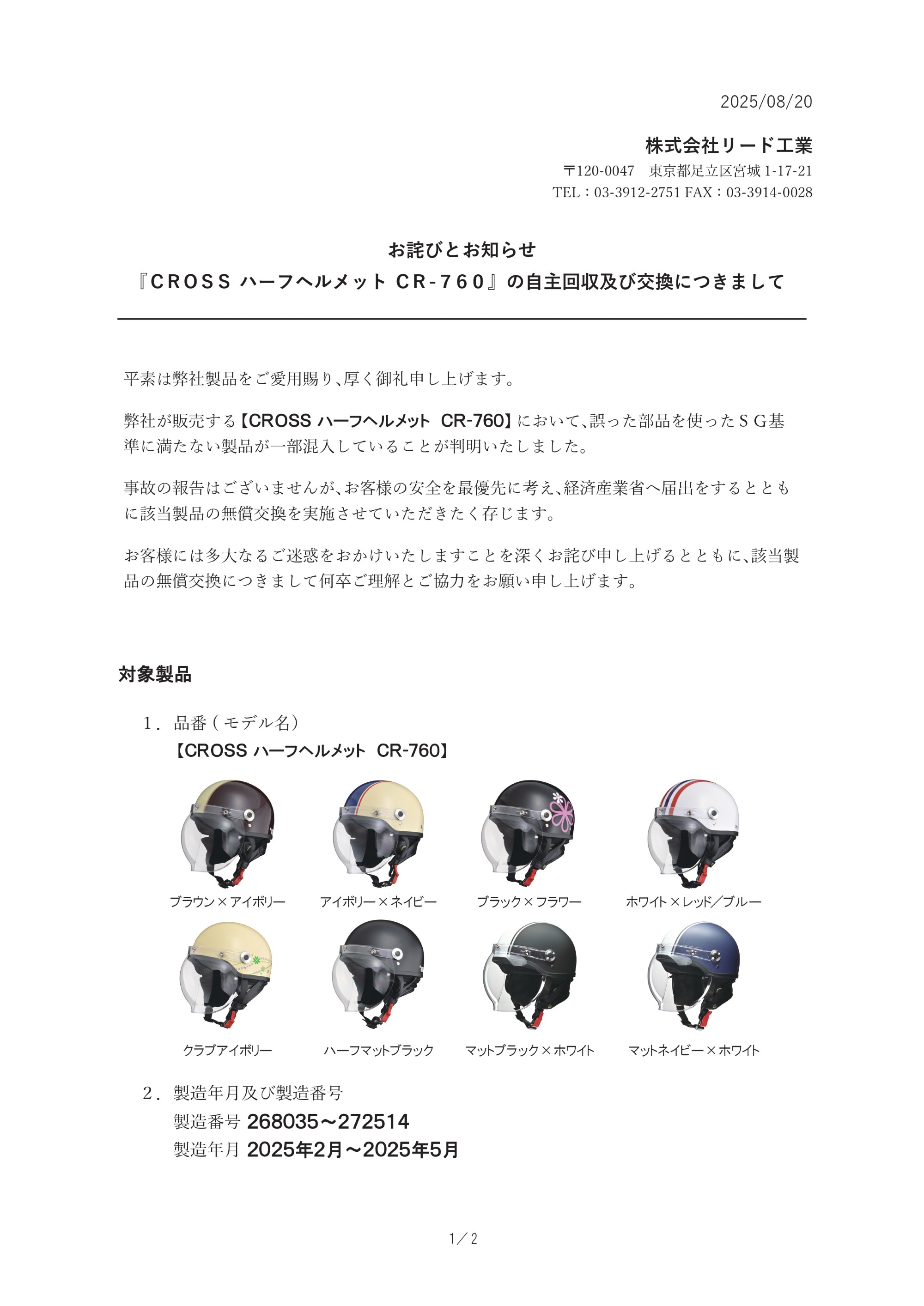 商品名:CROSS CR-760 ハーフヘルメット