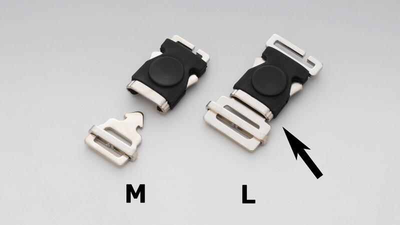 ヘルメットのアゴ紐を容易に脱着可能にするヘルメットワンタッチクリップ。ヘルメットのベルト幅に合わせてM・Lの2サイズからお選びください。
