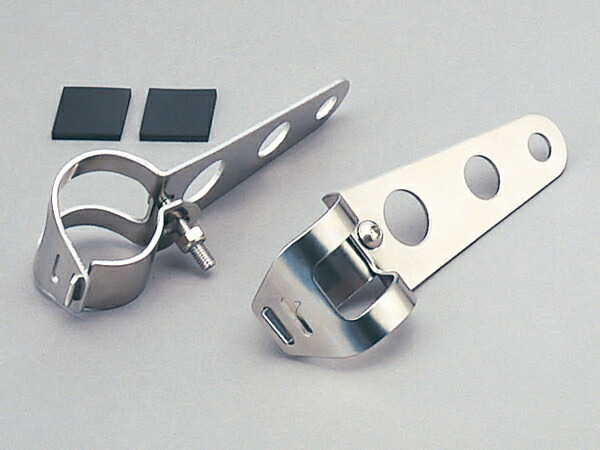 スチール/クロームメッキはこちらスチール/ブラックはこちら フロントフォークにクランプしてヘッドライトを挟み込むタイプのヘッドライトブラケット。