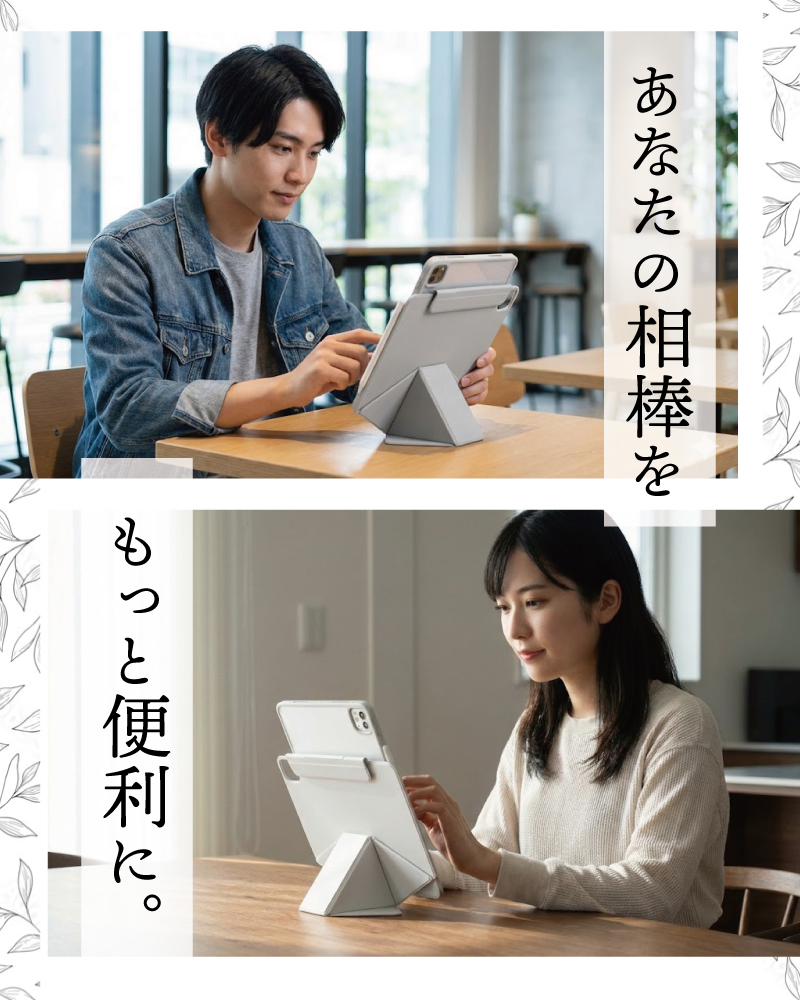 フロントカバーを折りたたんで様々な角度でスタンドできます。