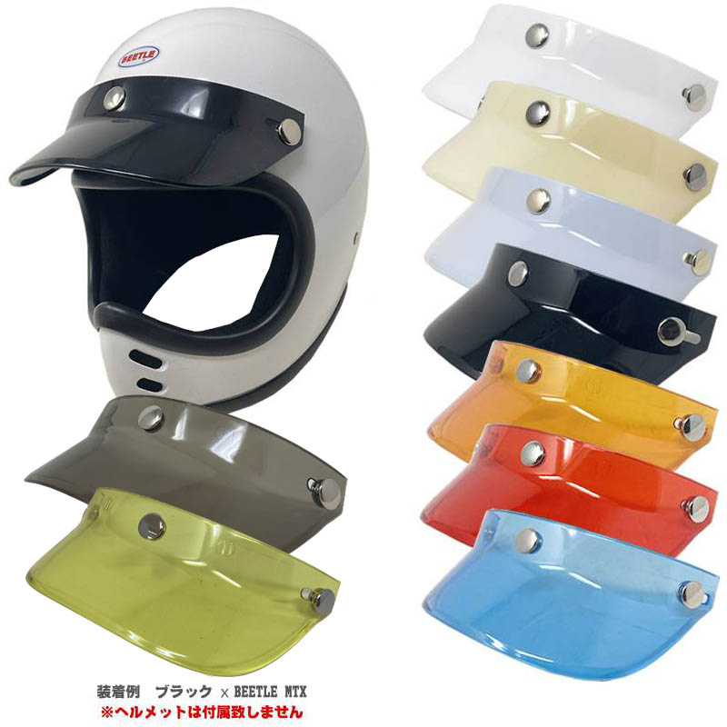 ■オーシャンビートル BEETLE SHORTYシリーズをはじめ、PTR、500TX、MTX、LAC、GREASER(グリーサー)、SMH、BELL(ベル)、BUCO(ブコ)などに装着可能なオールドスタイルヘルメットバイザー。 ※ただしドットボタンが付いているヘルメットのみとなります。