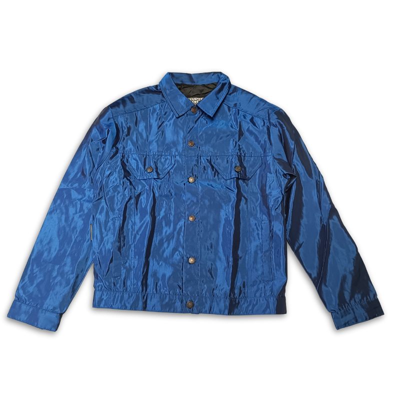 光沢があり立体的に色が変化して見える玉虫織物(シャンブレー織物)のブルゾンジャケットです。